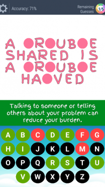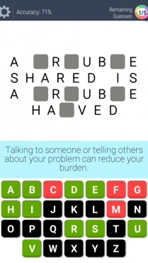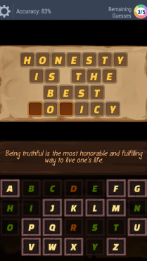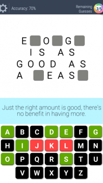 The game-play is similar to the classic Hangman game, but with proverbs, idioms, wise-sayings and famous quotes. You’re presented with a fill-in-the-blank letters, along with alphabet letters which you can choose to fill in the grid, to complete the mystery phrase.
