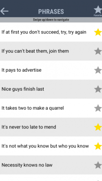 This app uses American-English (and in some cases Britain-English) vocabulary. The proverbs and phrases are all in English (with occasional Old English words). If you’re not an English speaker or if you’re learning English, the app might be a fun and educational activity to enhance your vocabulary and improve your knowledge of proverbs and idioms. Marvel at the skillful and beautiful use of words of whoever invented these proverbs and idioms. Discover the meanings of various popular proverbs and idioms, so that you know what they mean the next time you hear or read them.
