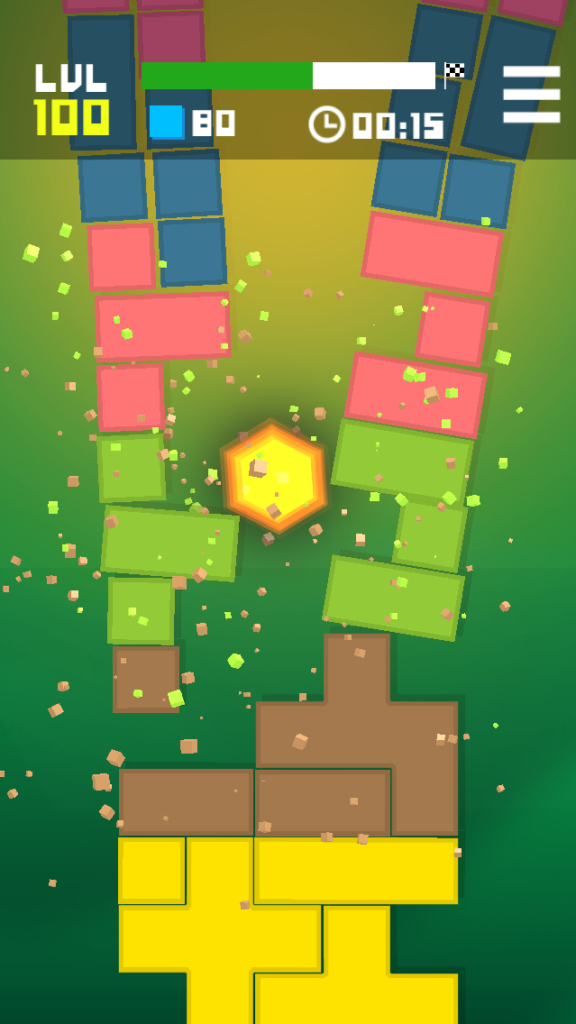 The levels are like puzzles because you need to pick carefully which block of mines to crush and smash, so that the tower structure doesn’t tumble and disintegrate. When blocks are destroyed they will disappear, and the tower/structure becomes shorter. However, not only the block you tap will be crushed, but that block may affect other blocks, causing them to roll, drop, fall or slip. Consequently, the hexagon will react to the law of physics (it has six sides, so it’s almost like a ball) – don’t let it fall before it reaches the ground. So the puzzle game element is deciding which block to crush.