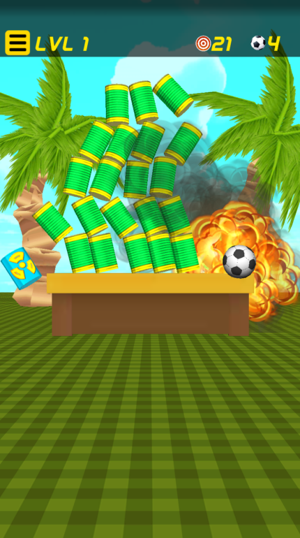 The levels include multiple environments with varying cans, barrels, drums, and power ups configurations and formations. Some of the configurations require problem solving to add to the challenge. Sometimes the targets are elevated and stacked on platform such as desk, wood, or blocks – but these can be knocked down too.
