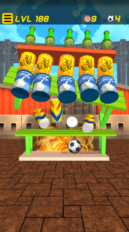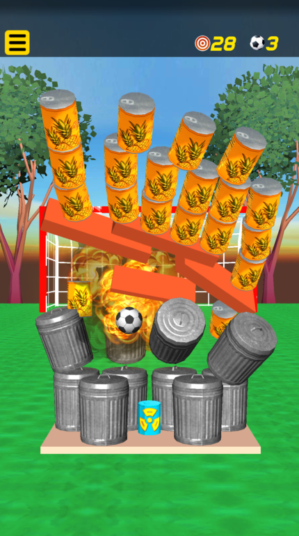 Featuring several environments from the greenish soccer-field, serene cottage, to an industrial warehouse. The targets are varying cans, barrels, drums, and power ups configurations. Try to knockdown the cans, barrels, drums, etc. with as few balls as possible.